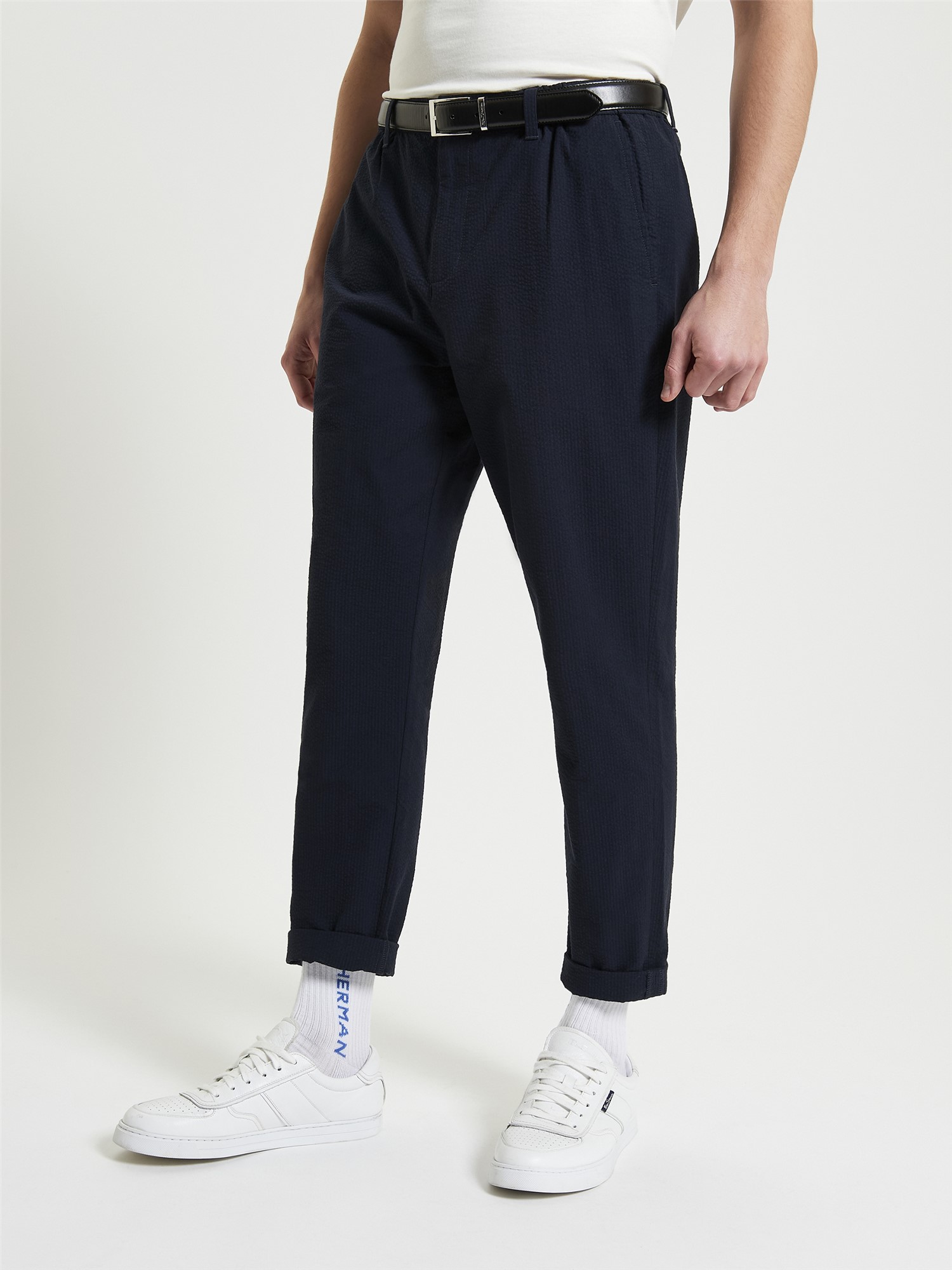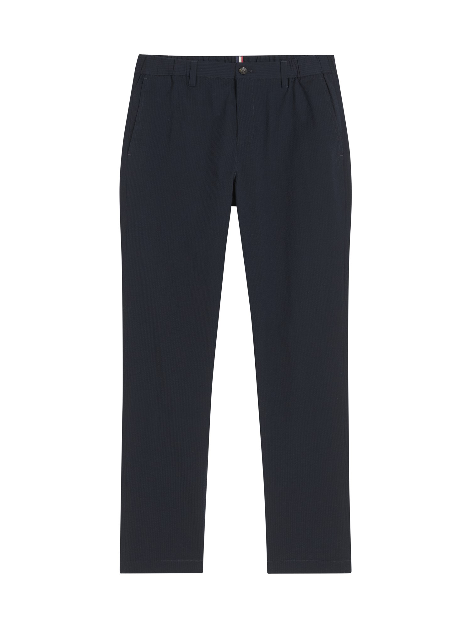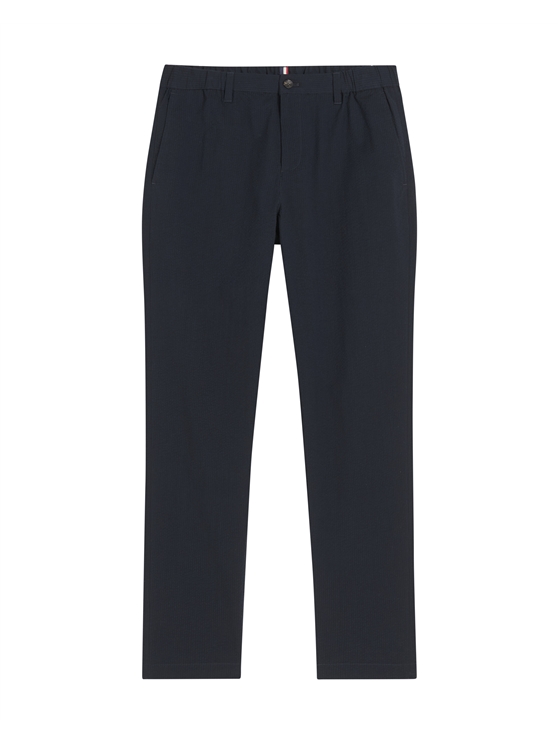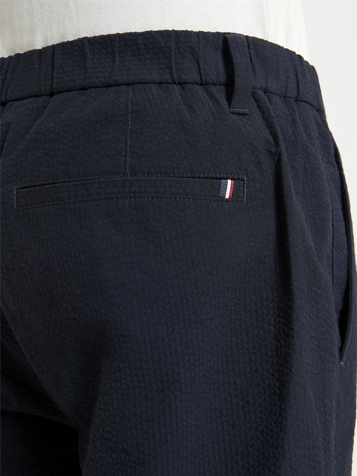 A slim taper fit trouser in a seersucker fabric. Features include four external pockets and a elasticated waistband. With a nod to our heritage this style features the mod tape at the waistband and back pocket.