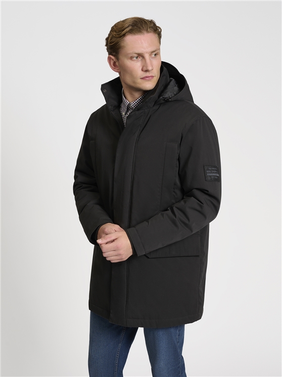 A wadded parka with a water resistant finish. Features include fleece lined double entry pockets, rubber coated snap buttons and a 3 piece hood. This piece has 2 internal pocket and a 'Ben Sherman' branded arm badge.
