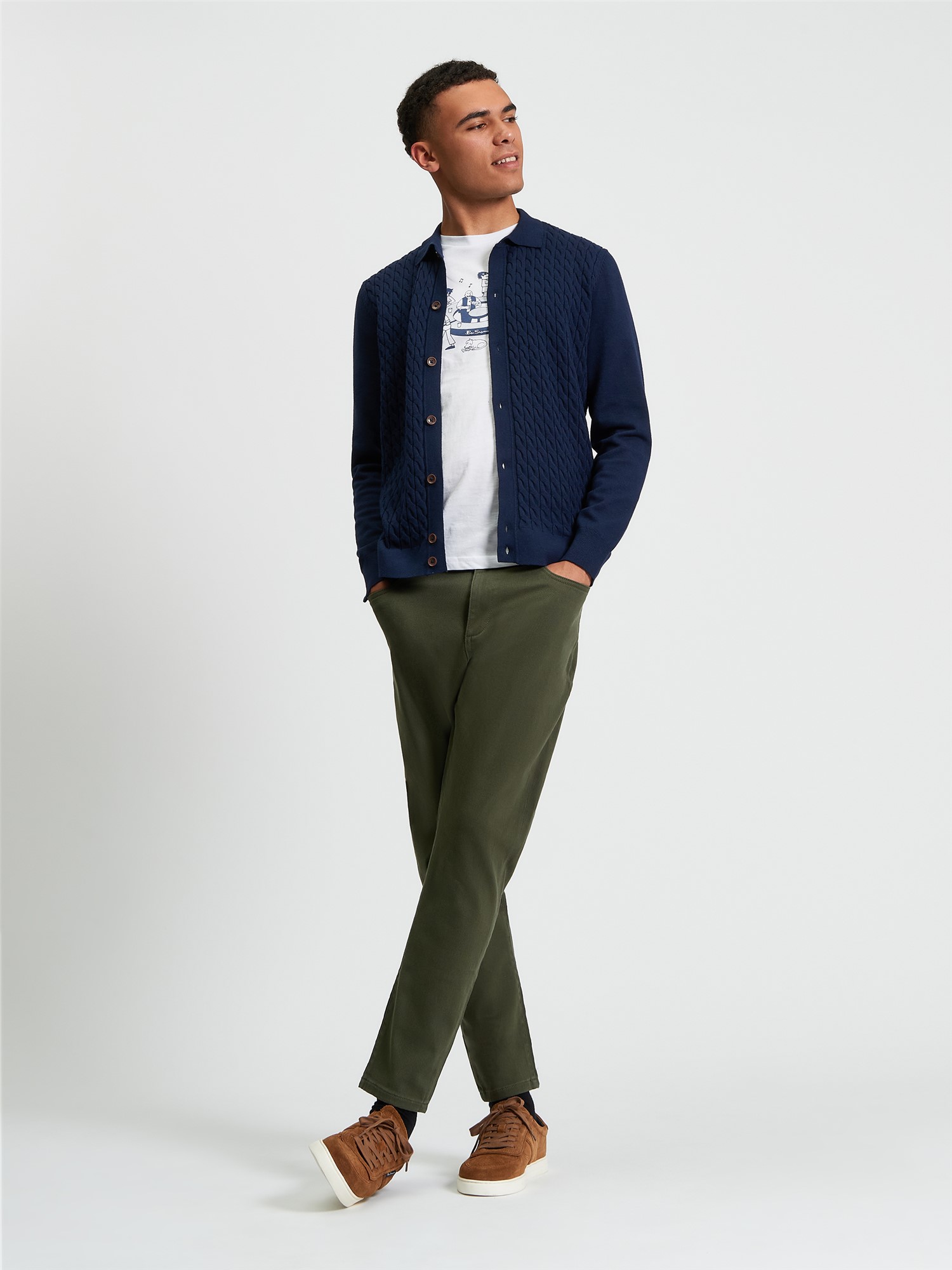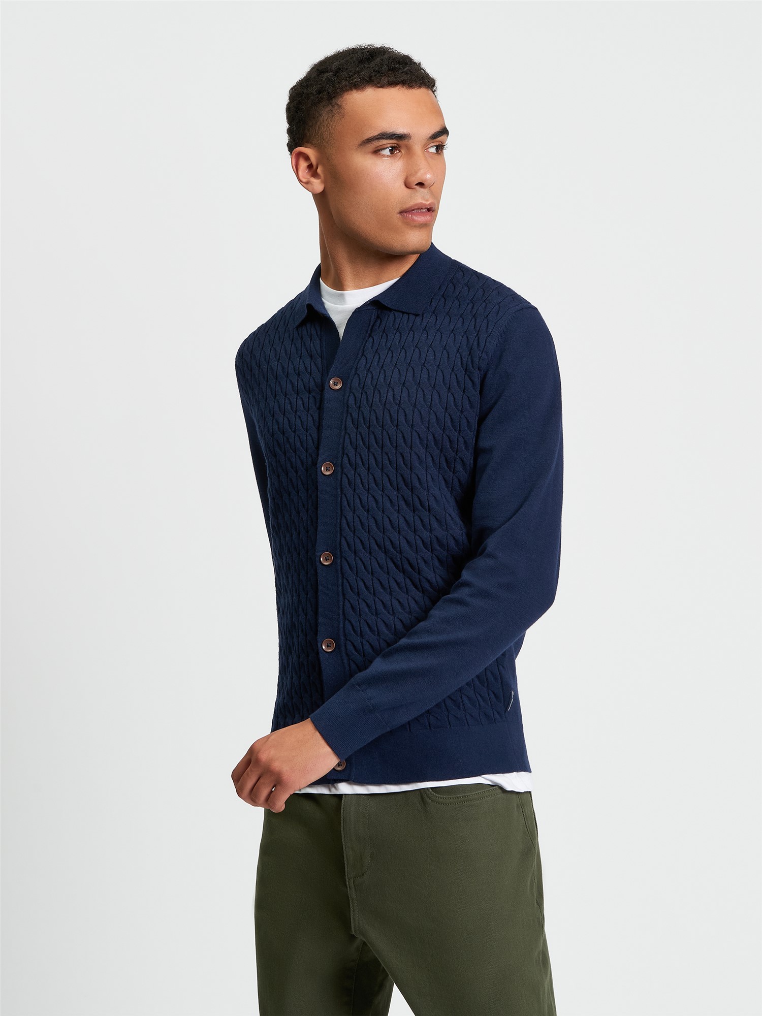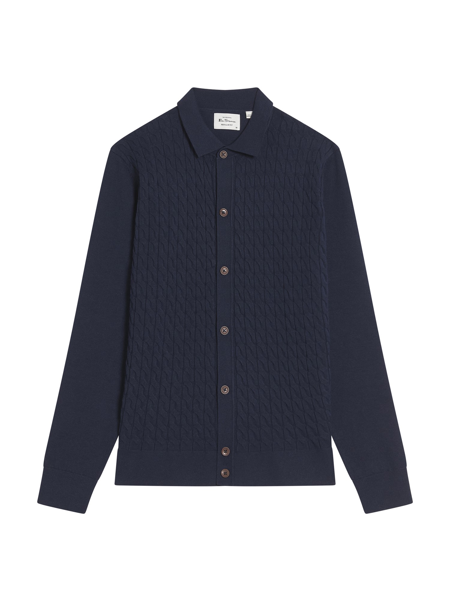 This long sleeve knitted button through cable polo feature a button fastening and a Ben Sherman branded woven label on the side seam. A regular fit.