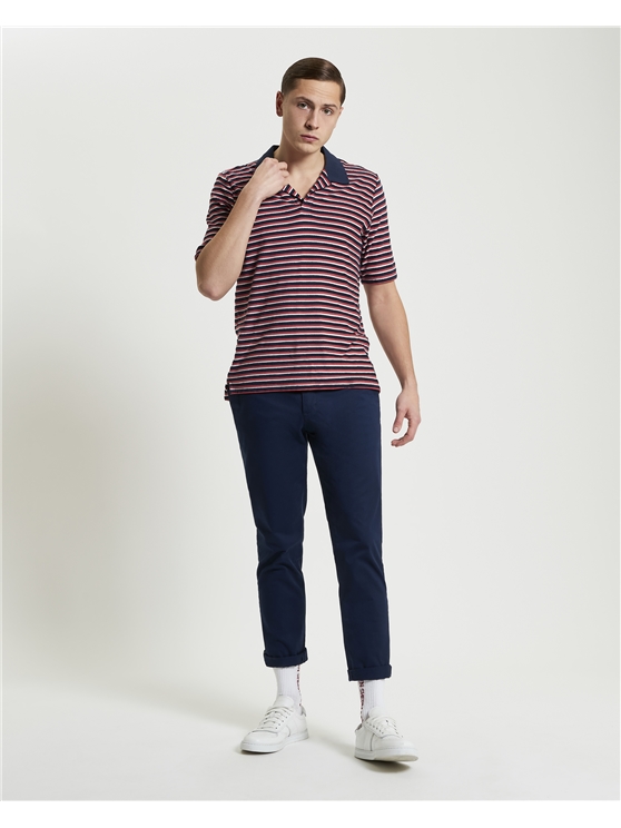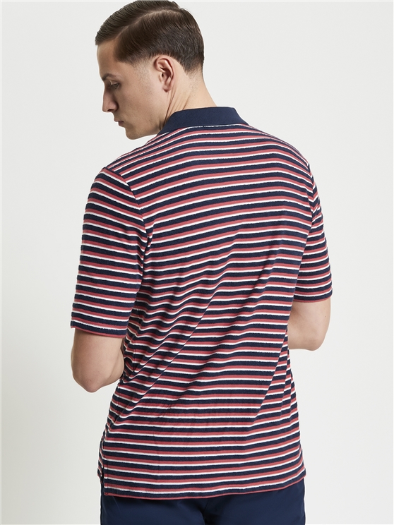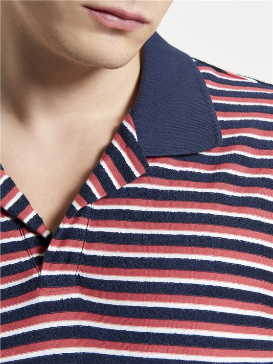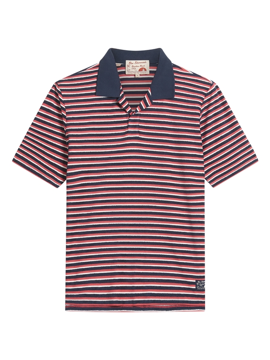 A relaxed fit polo in a loopback cotton fabric, features a horizontal stripe design and a open neck placket. As part of our 'Brighton Beach Club' collection this style is complete with a external badge.