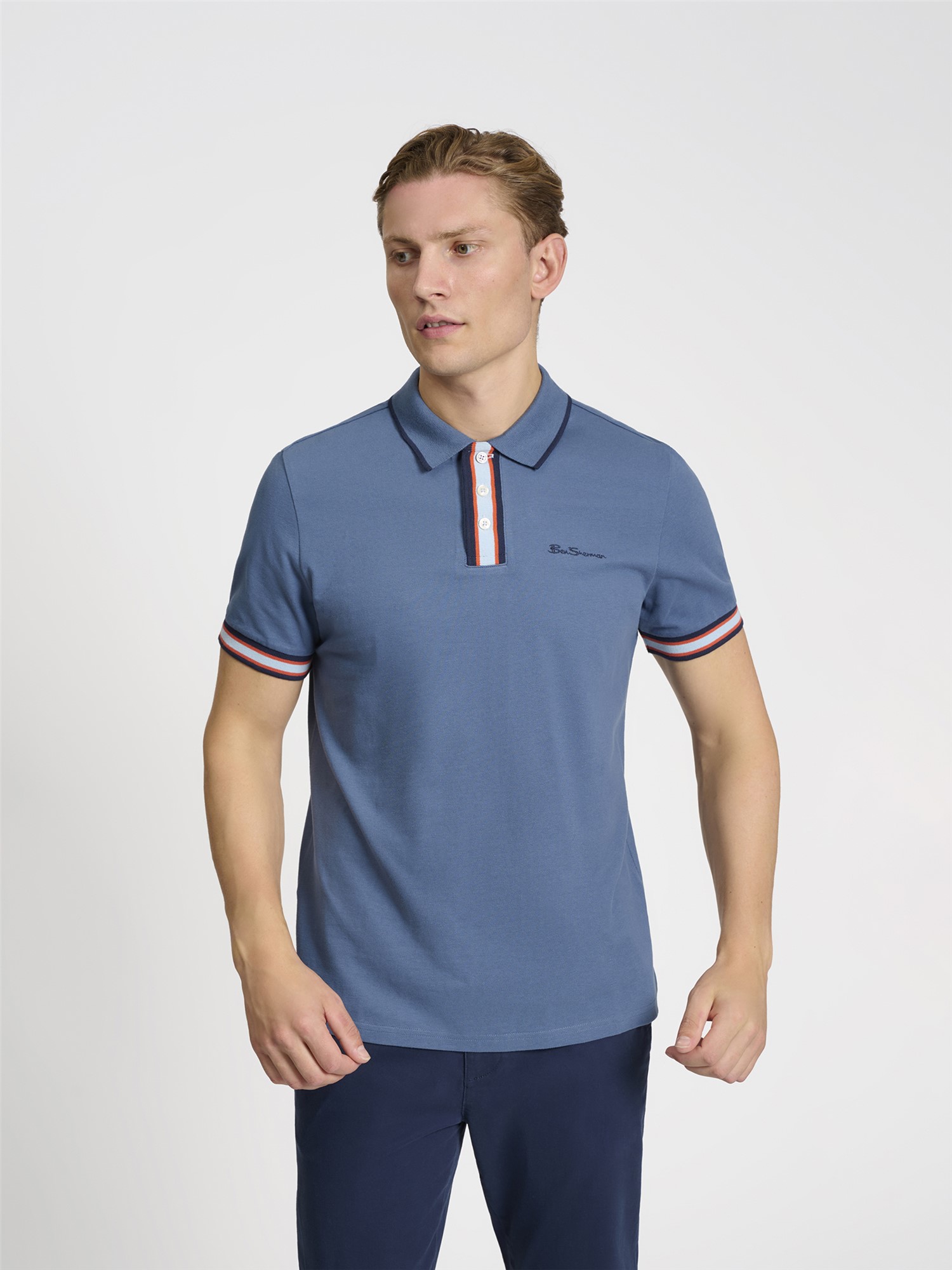 Made from 100% cotton, this short sleeve pique polo features a contrast stripe placket and cuff as well as a three button placket. A regular fit, completed with embroidered Ben Sherman chest logo.