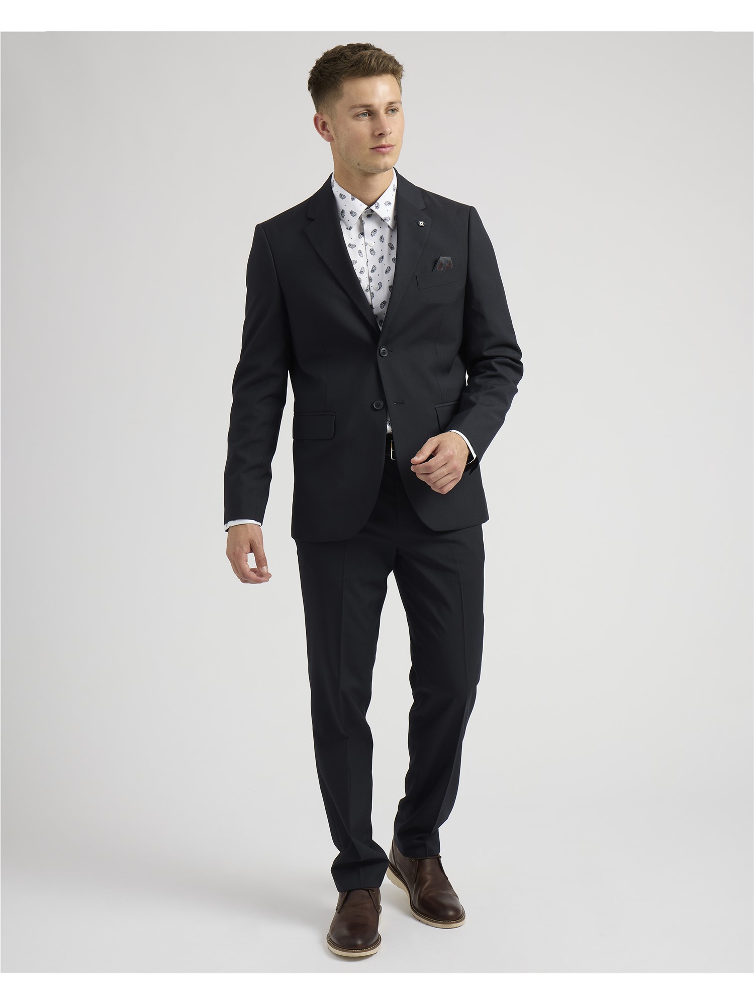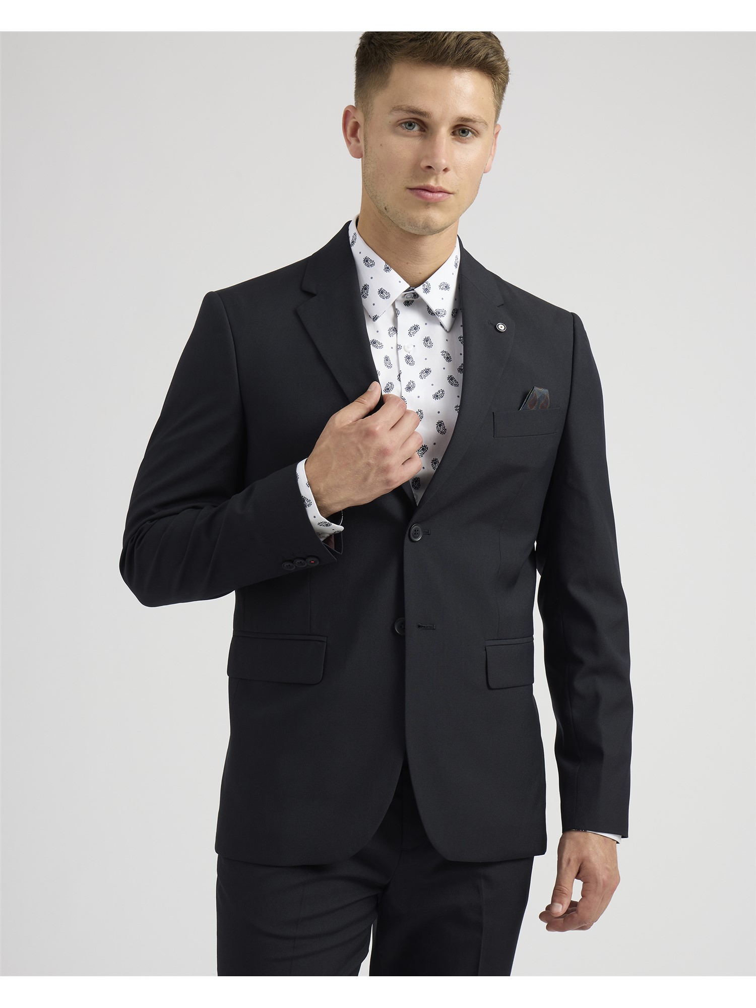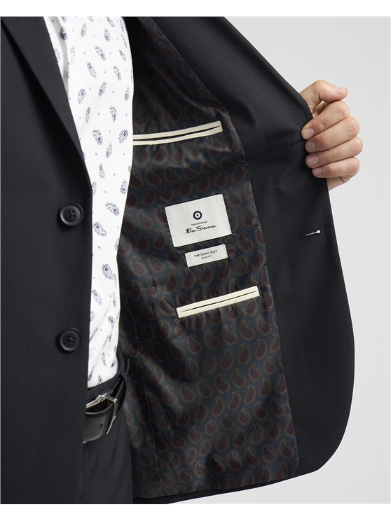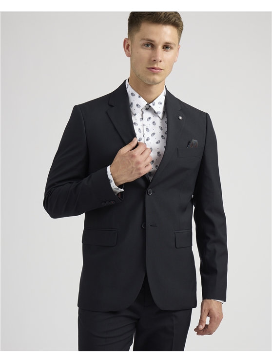Look Sharp in the Ben Sherman Soho Suit. Crafted in a clean finish poly blend and cut to a slim fit. Single breasted with 2 button fastening and complimented with paisley printed lining. Paired with matching slim fit trouser.