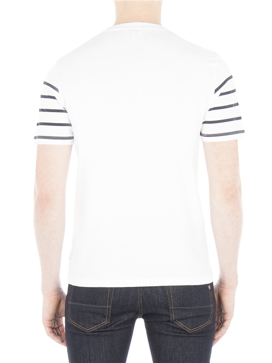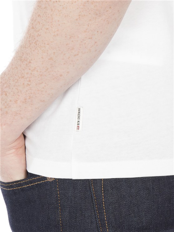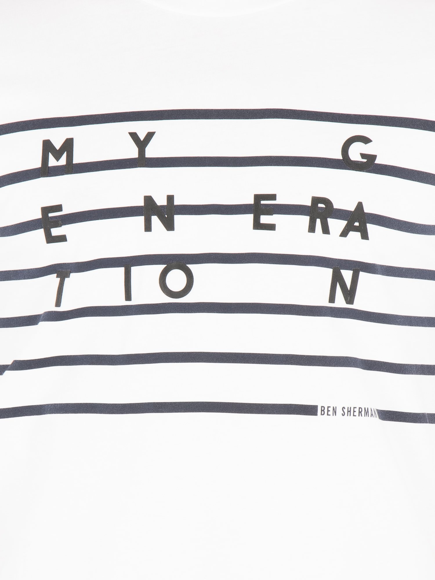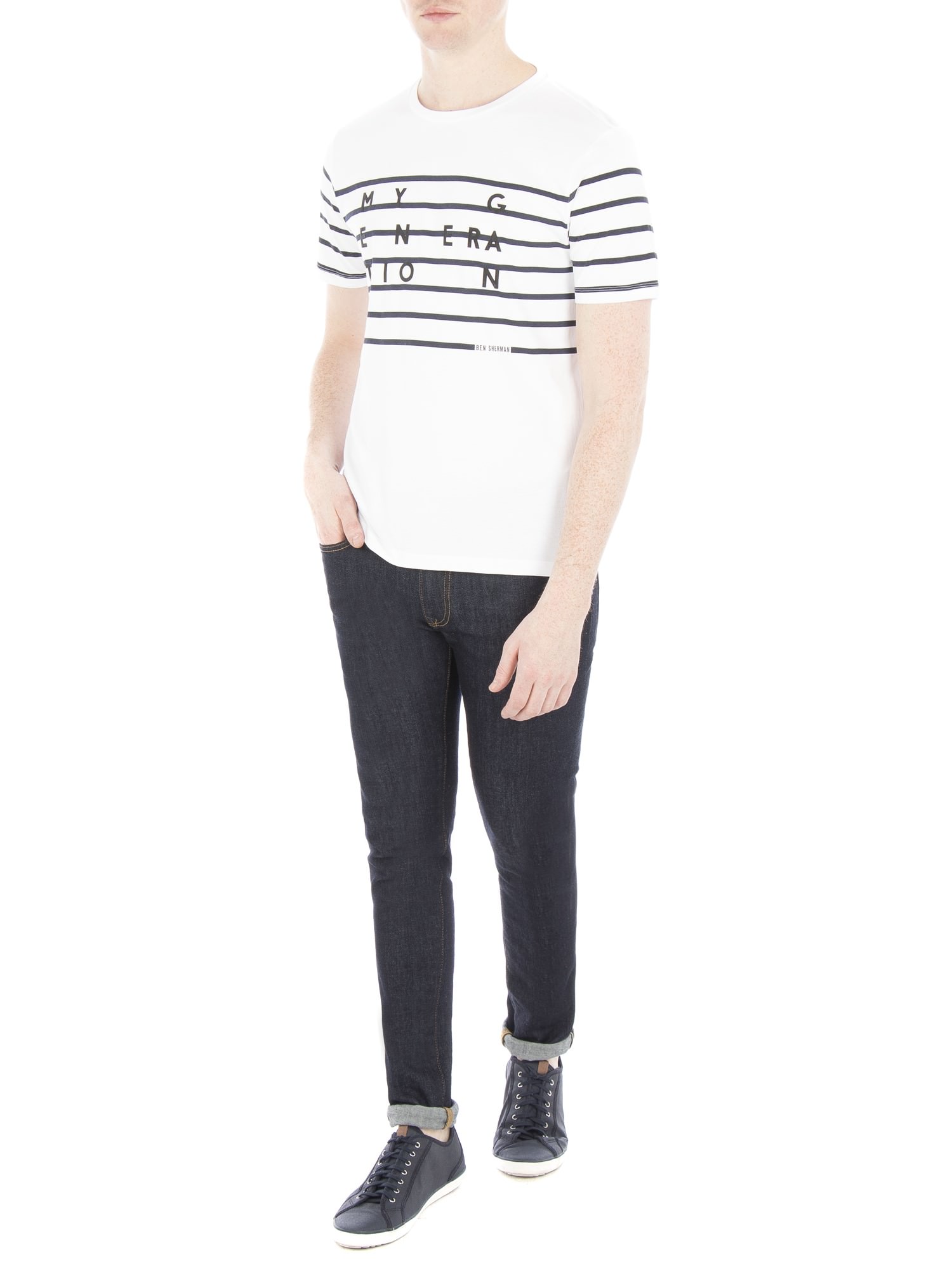 Classic Fit 100% cotton crew neck T-Shirt. It features a raised rubber typography print layered over a printed chest stripe with Ben Sherman tab branding at the side seam