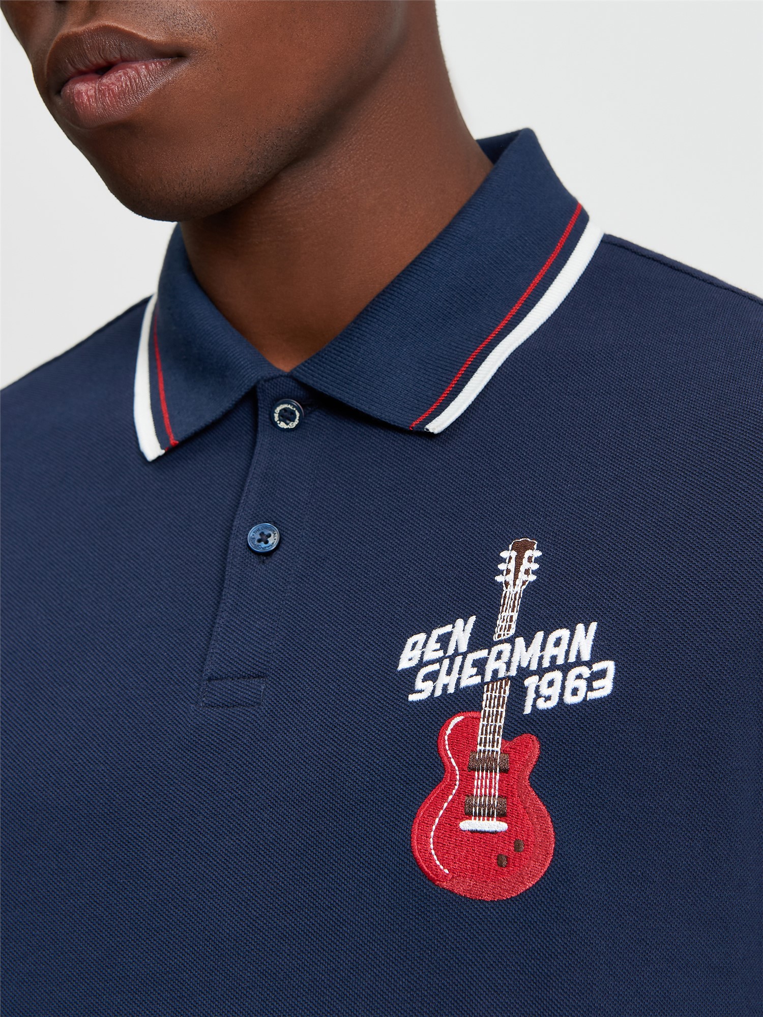 Made from 100% cotton, this short sleeve pique polo features a guitar themed embroidery at chest and a two button placket. A regular fit, completed with accept tipping at the collar.