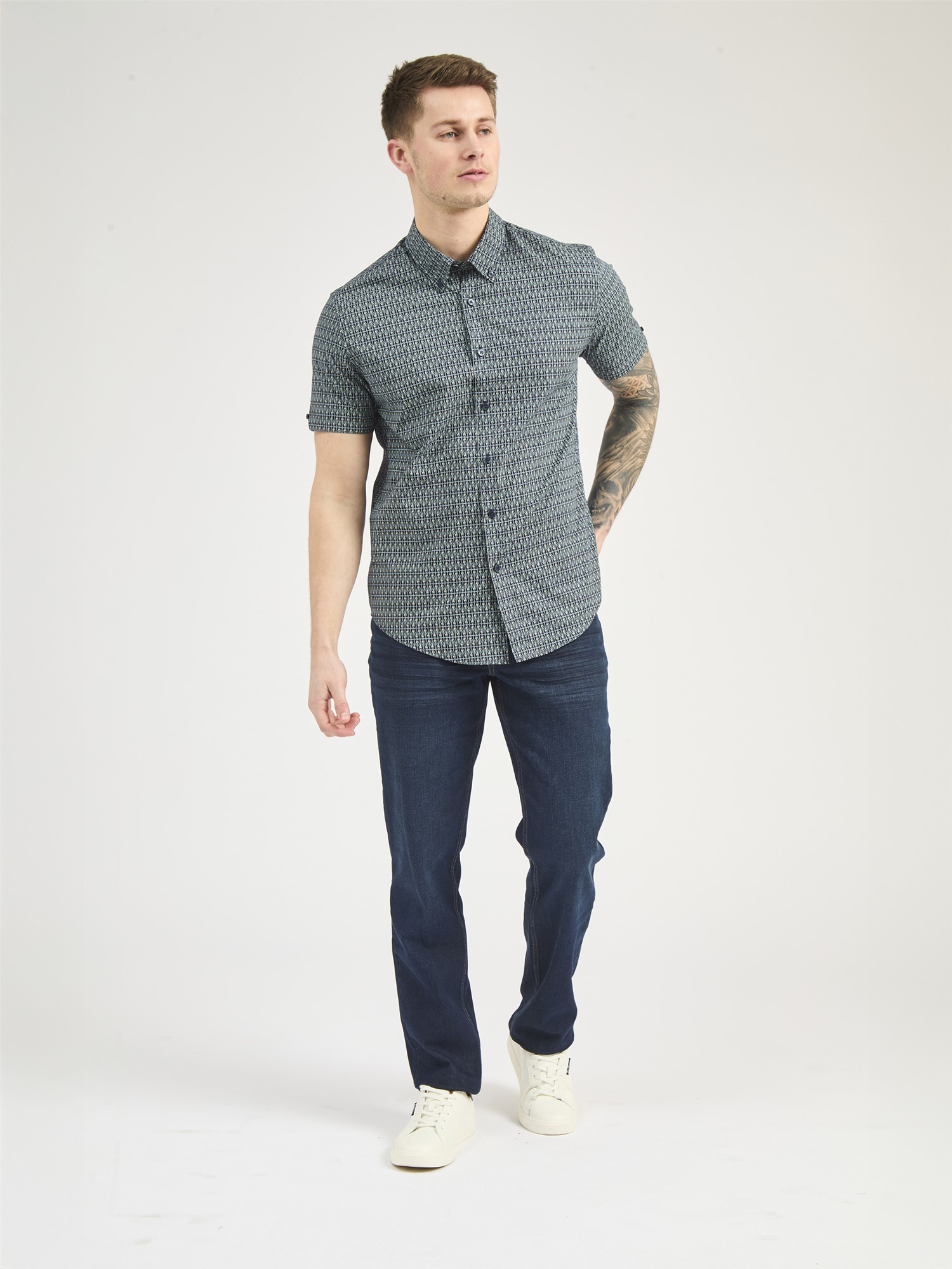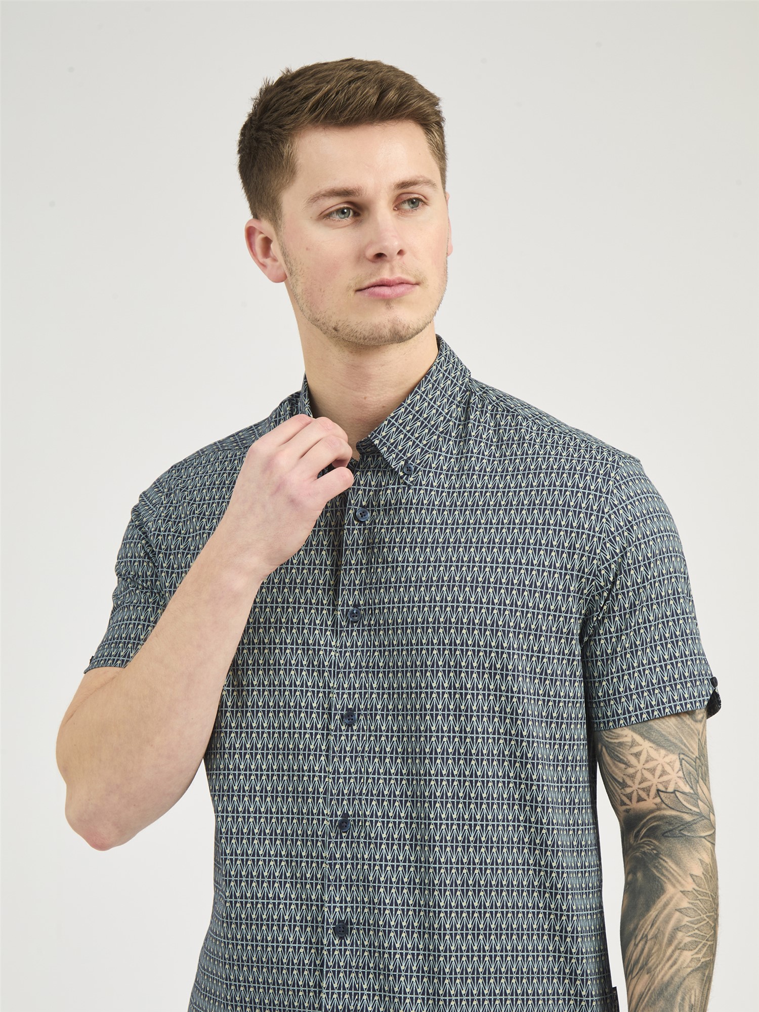 A regular fit shirt designed with a geo spot print. Featuring a curved hem, two finger button down collar and a Ben Sherman branded woven tab at the side seam. Made from 100% cotton.