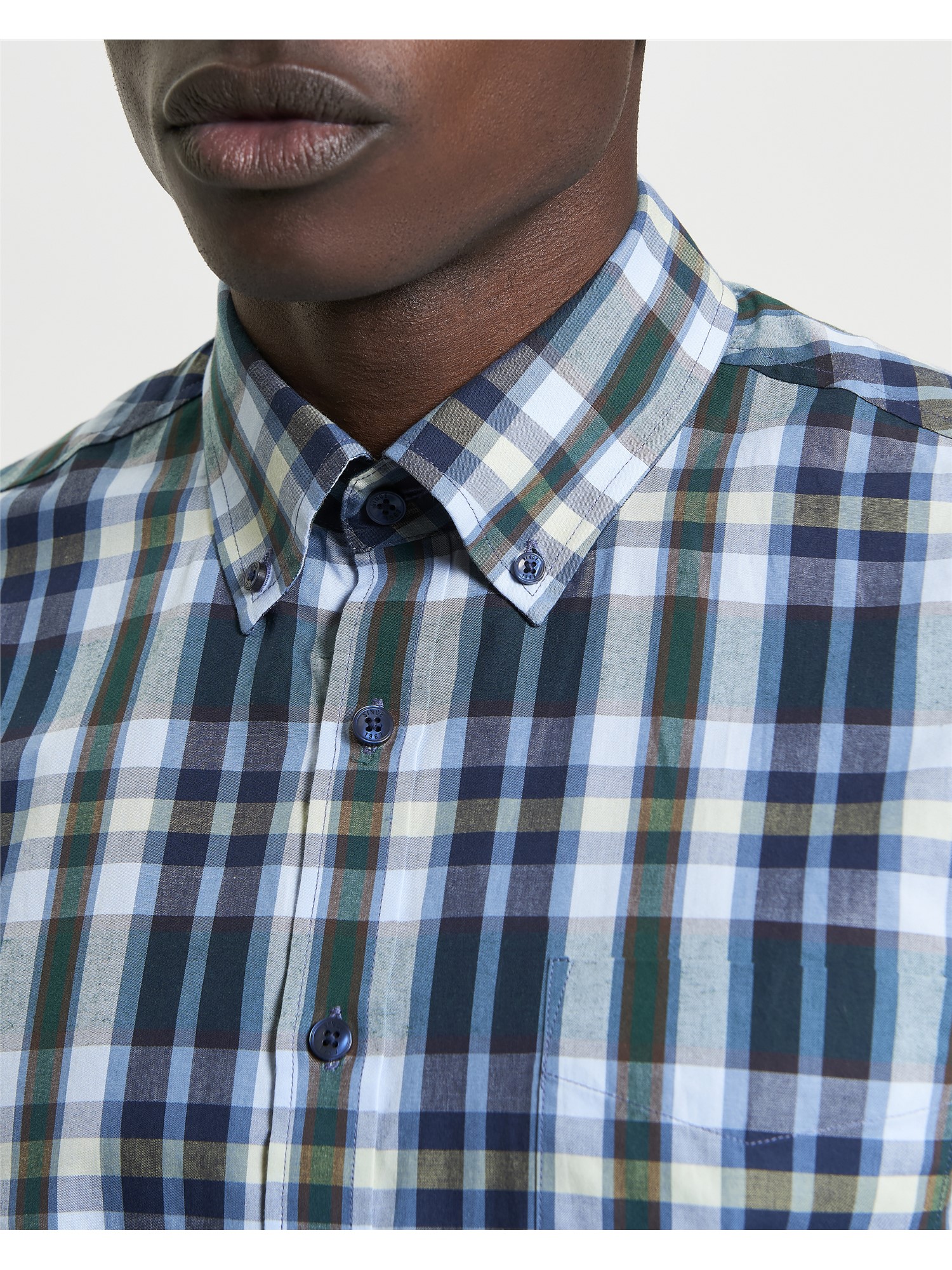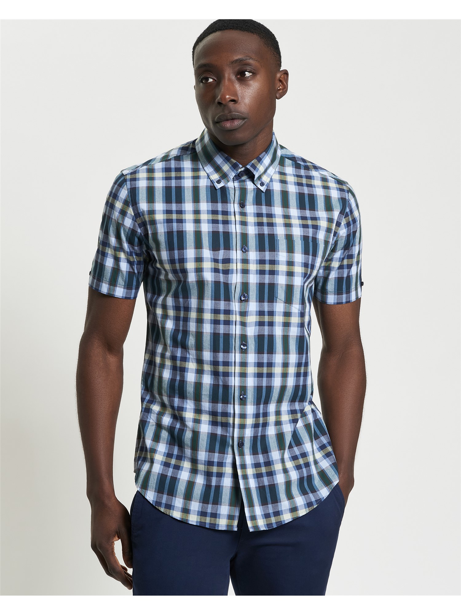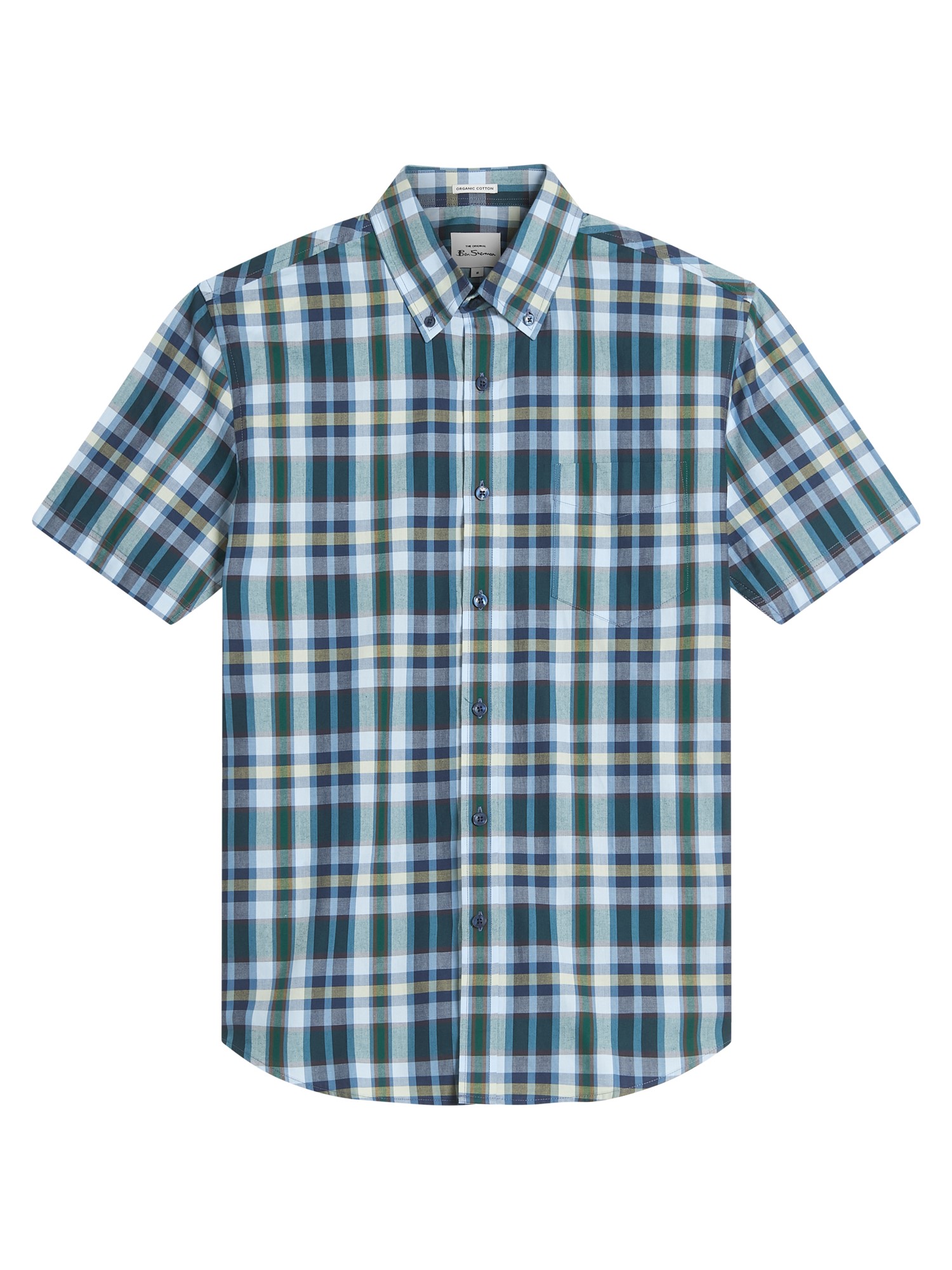 A regular fit shirt designed with an irregular check. Featuring a curved hem, three finger button down collar and a 'Ben Sherman' branded woven label at the chest pocket. Made from 100% organic cotton.