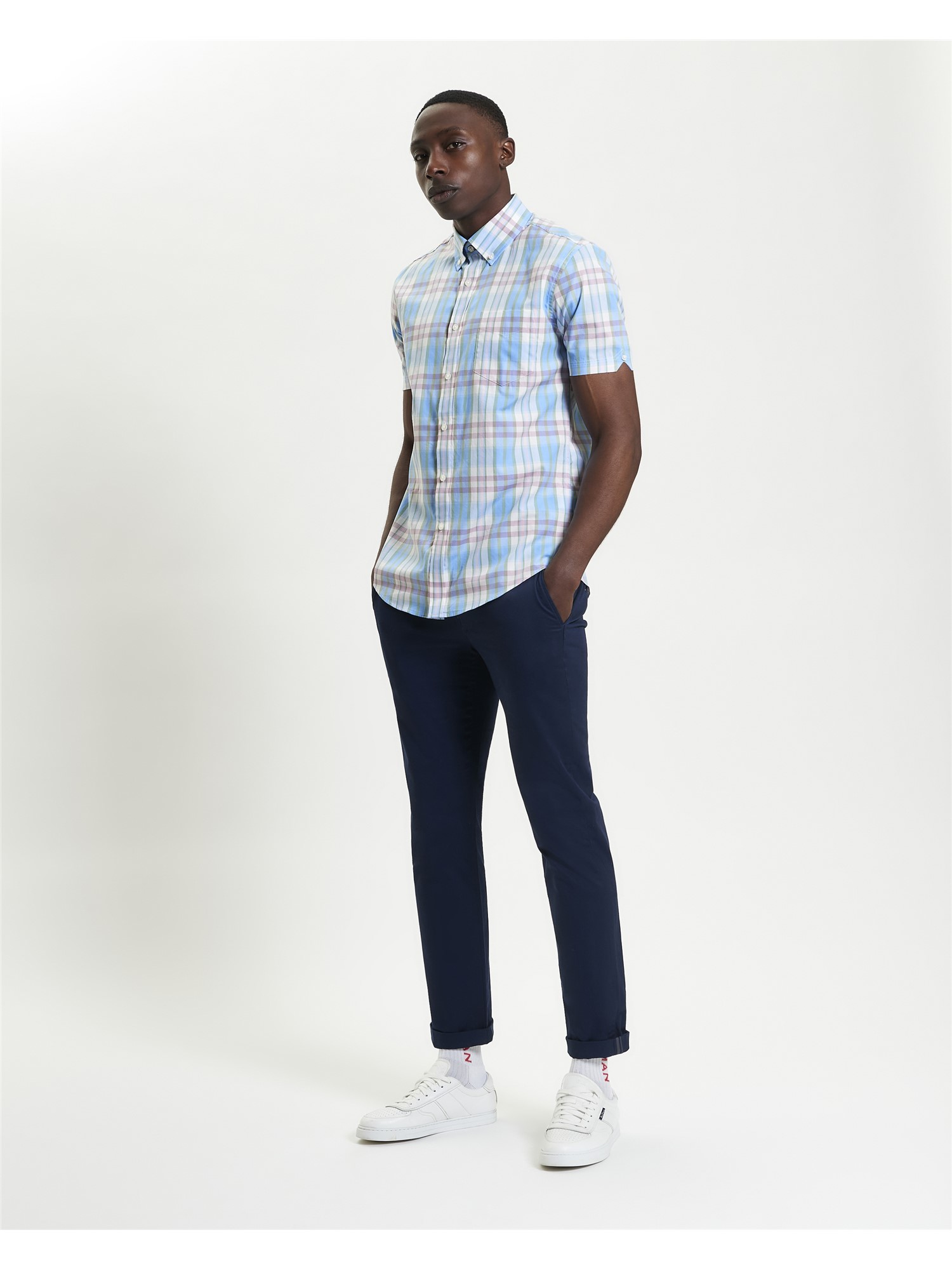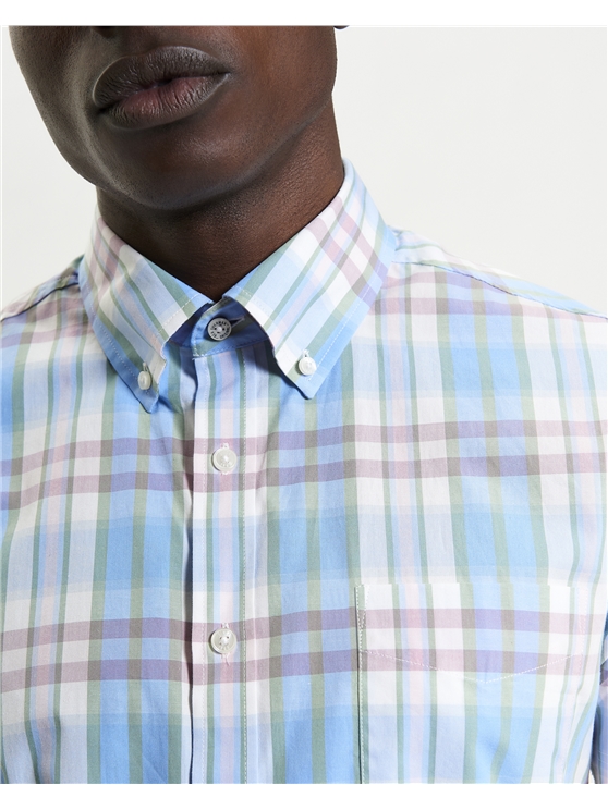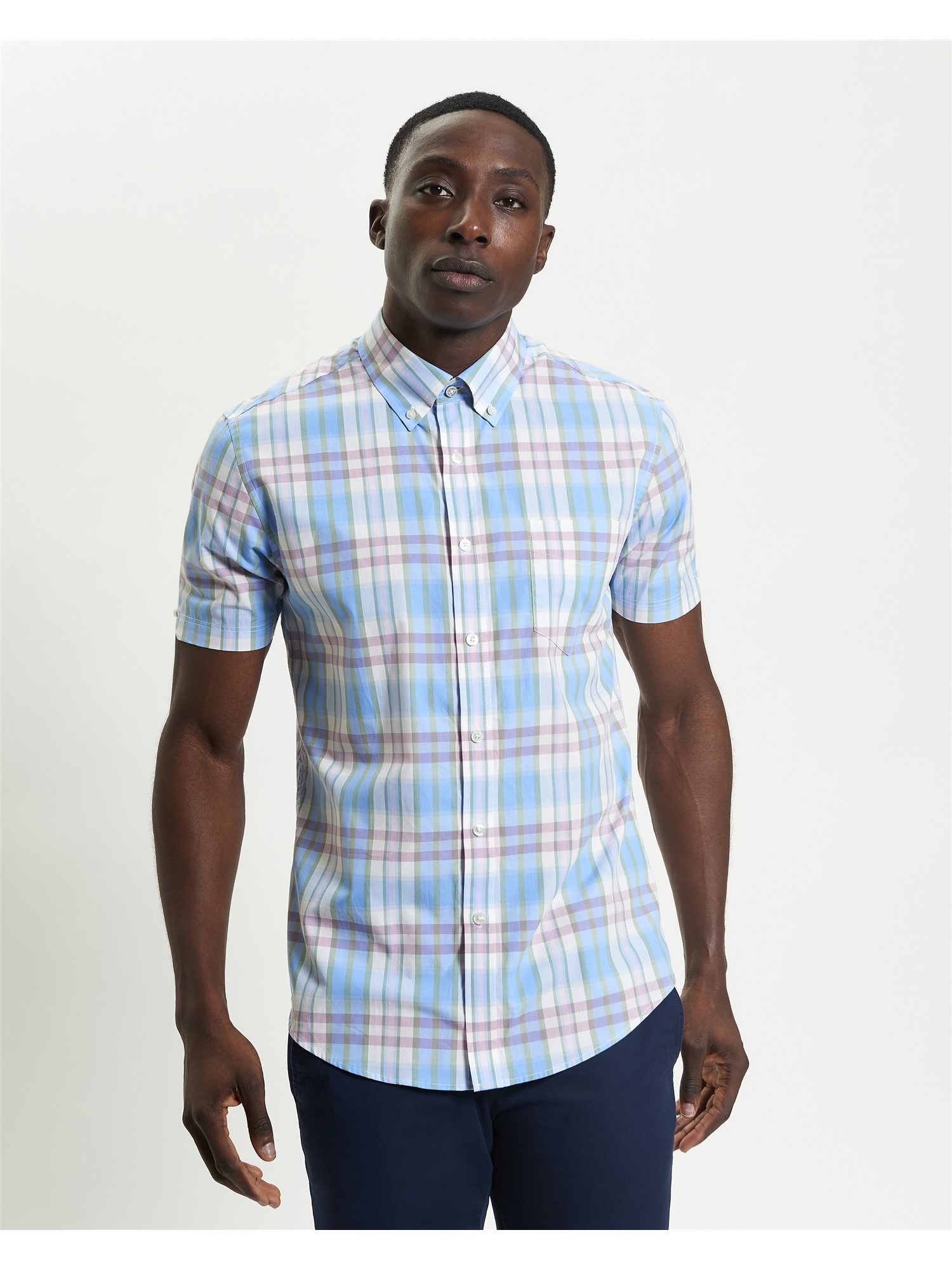 A regular fit shirt designed with an irregular check. Featuring a curved hem, three finger button down collar and a 'Ben Sherman' branded woven label at the chest pocket. Made from 100% organic cotton.