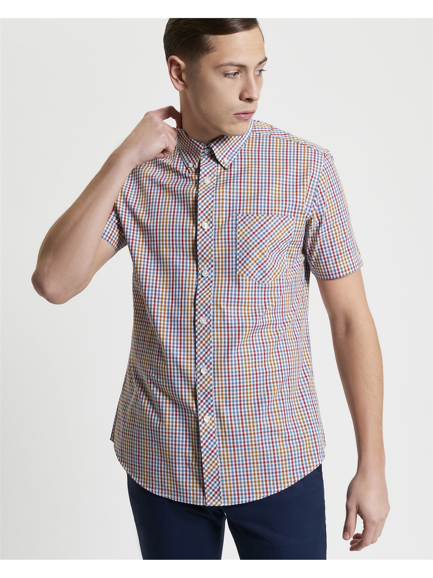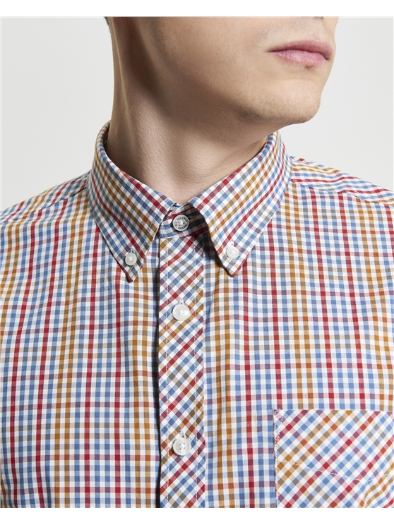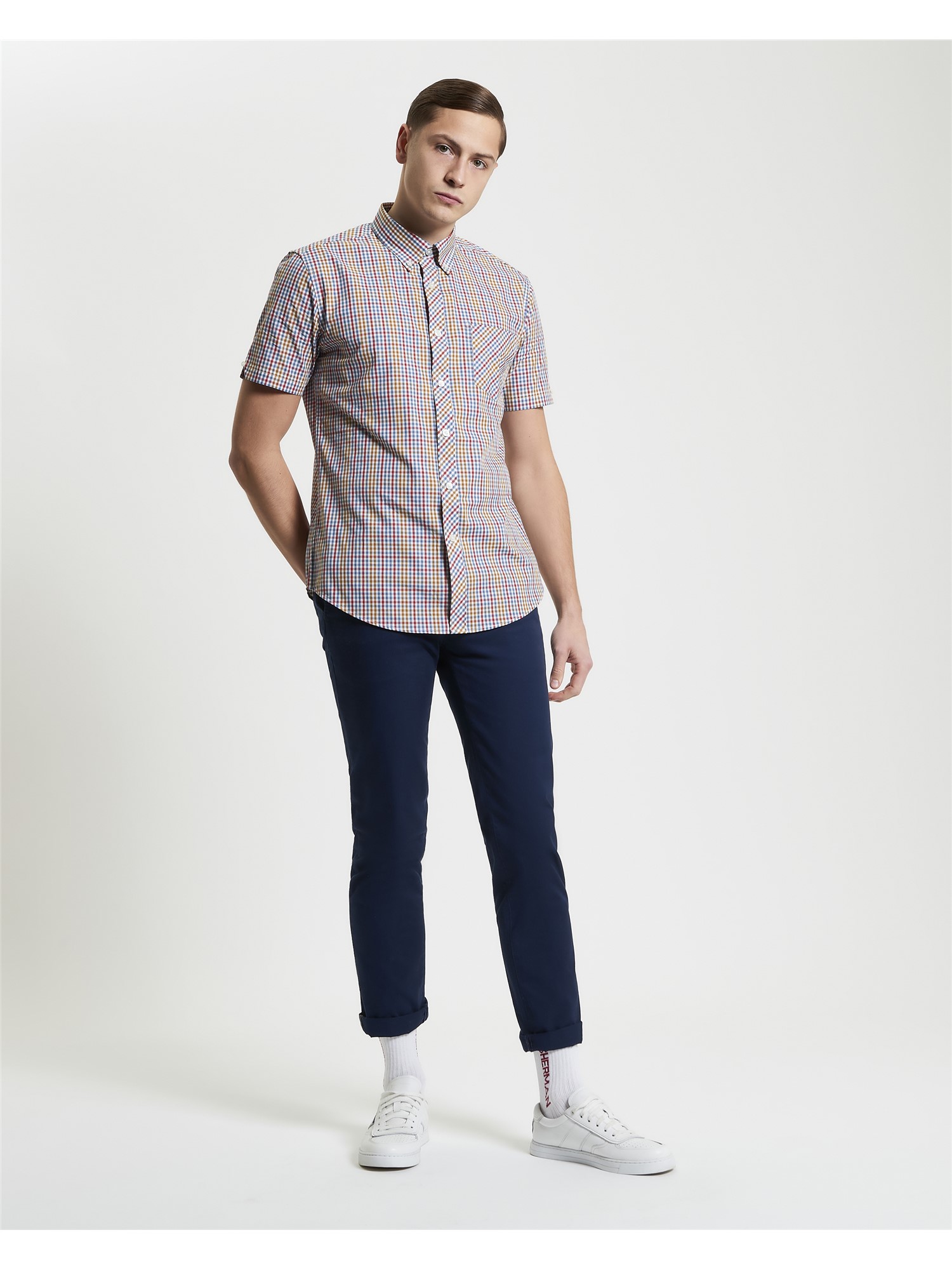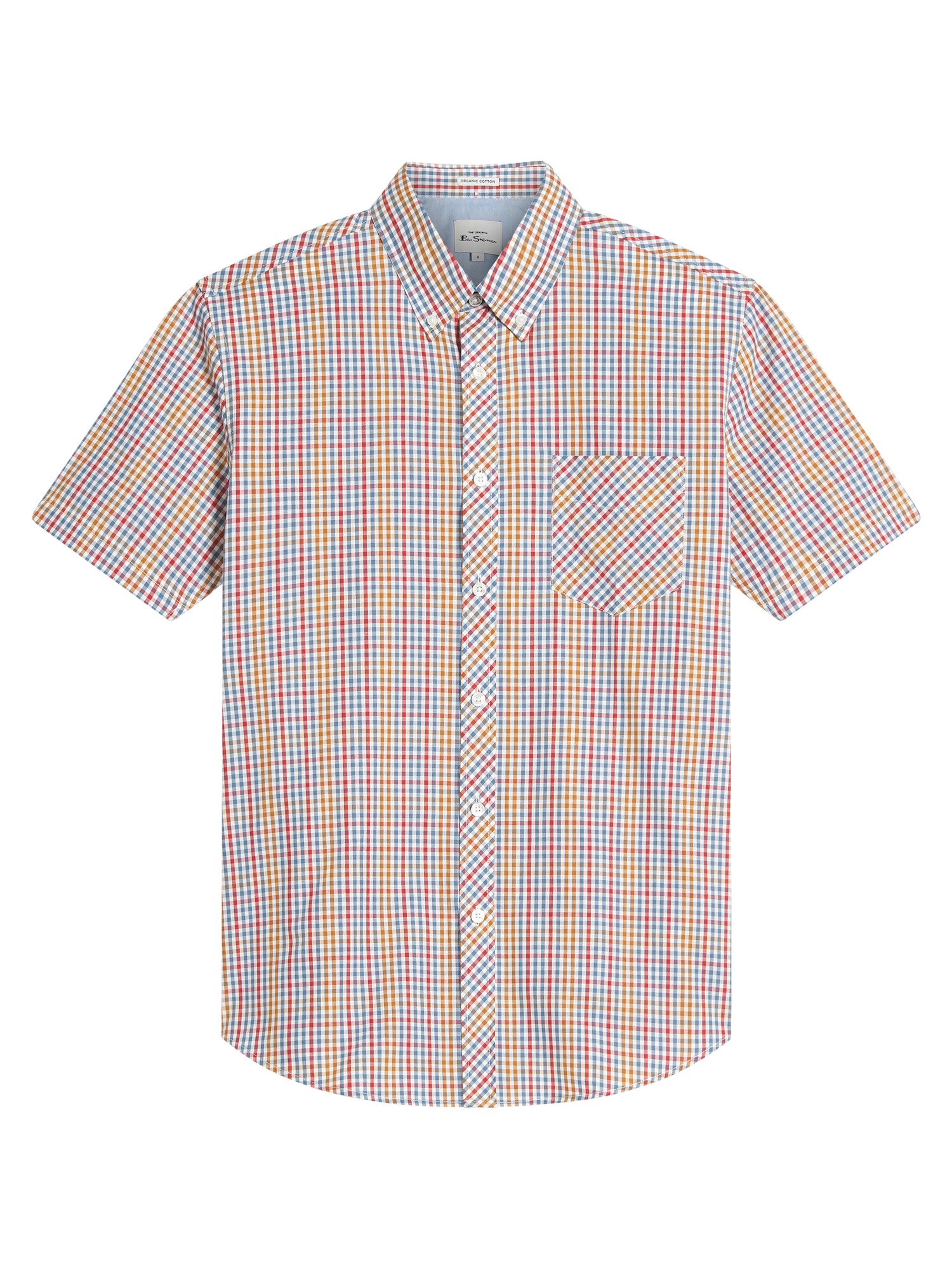 This short sleeve mini gingham check features a curved hem and a two finger button down collar. Made from 100% organic cotton, this regular fit shirt is completed with a 'Ben Sherman' branded woven label at the side seam.