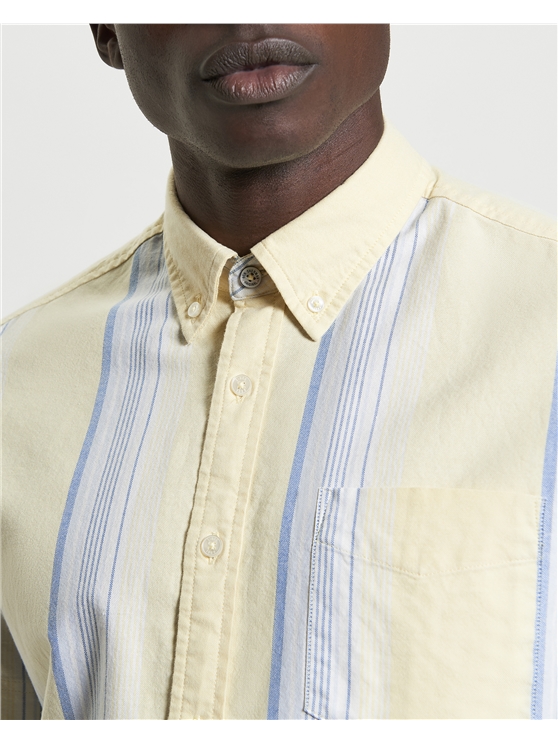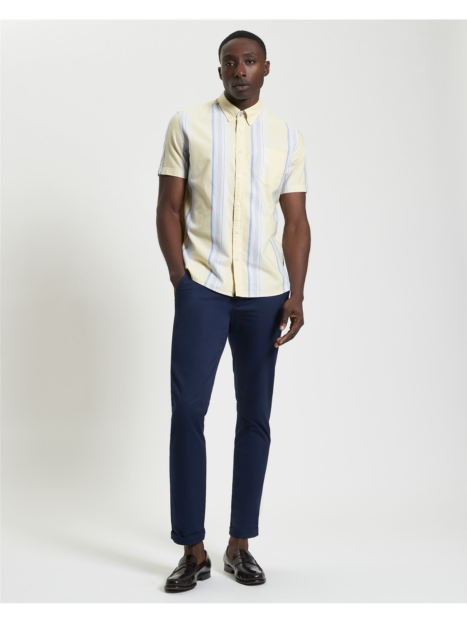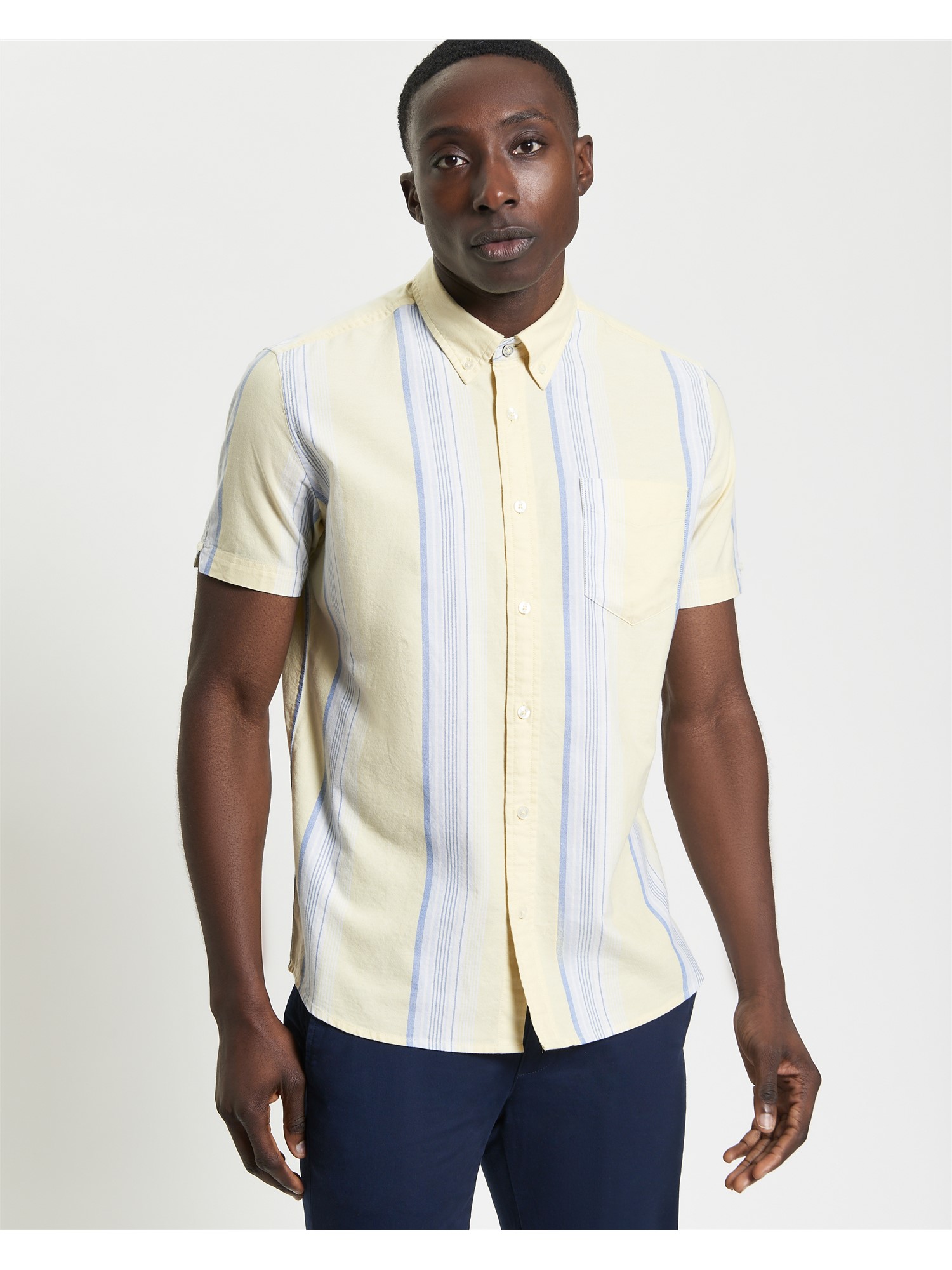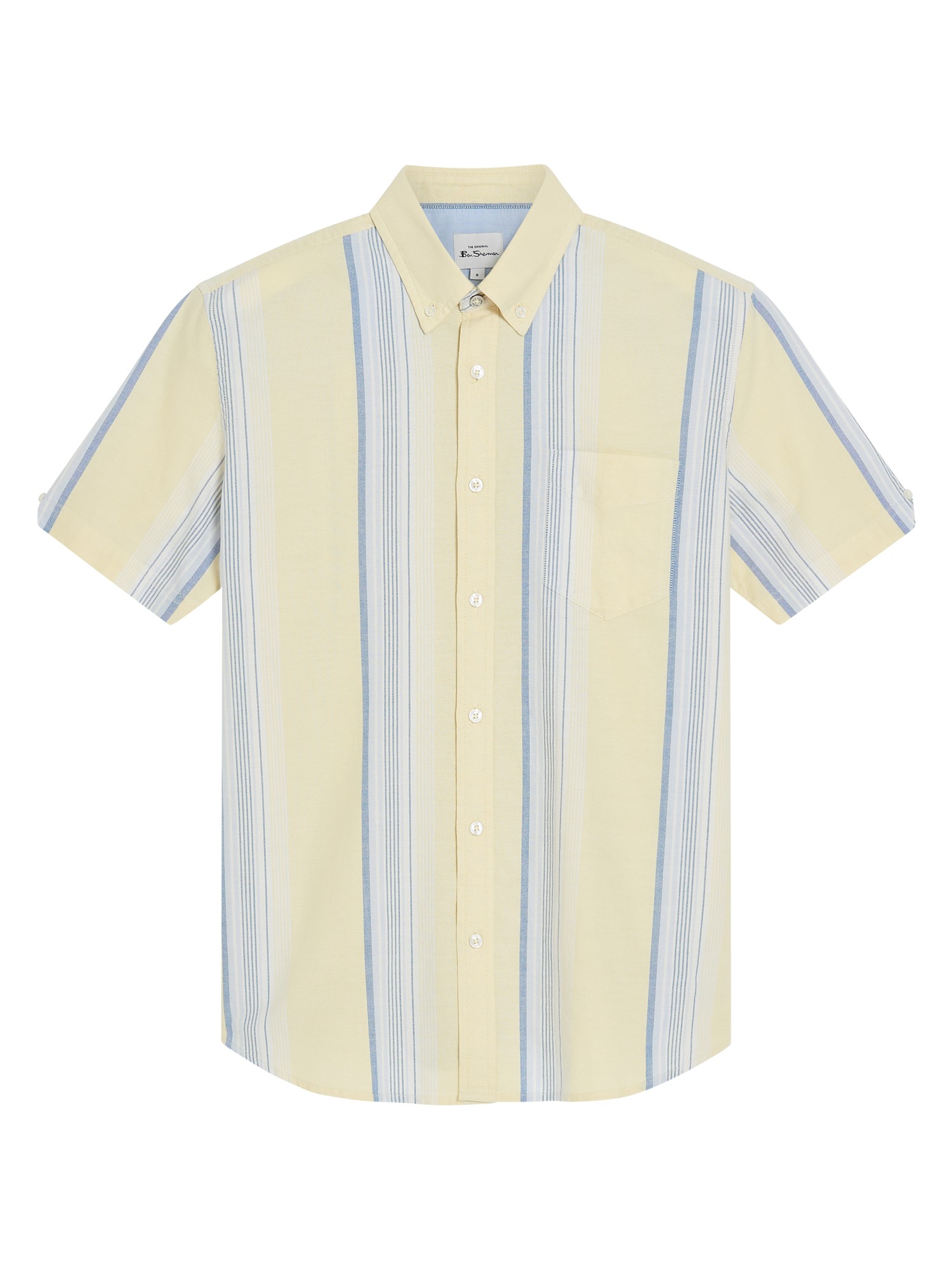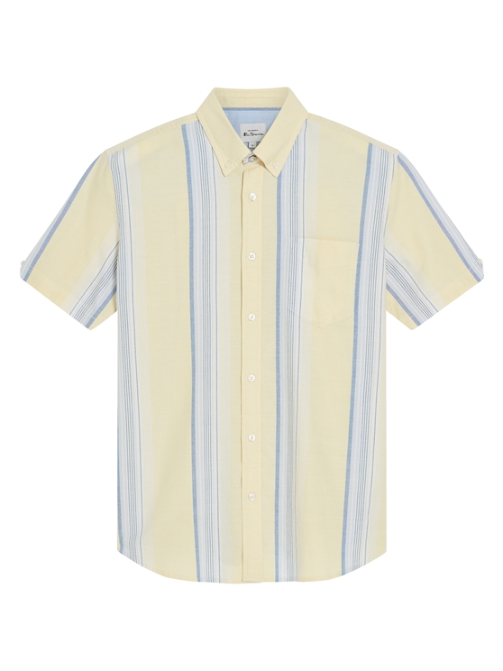 This short sleeve oxford stripe shirt features a curved hem and a two finger button down collar. Made from 100% cotton, this classic fit shirt is completed with a 'Ben Sherman' branded woven label on the side seam.
