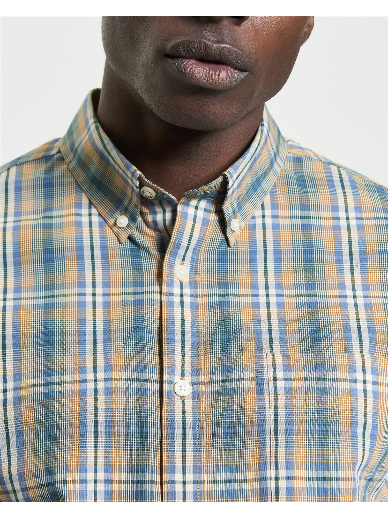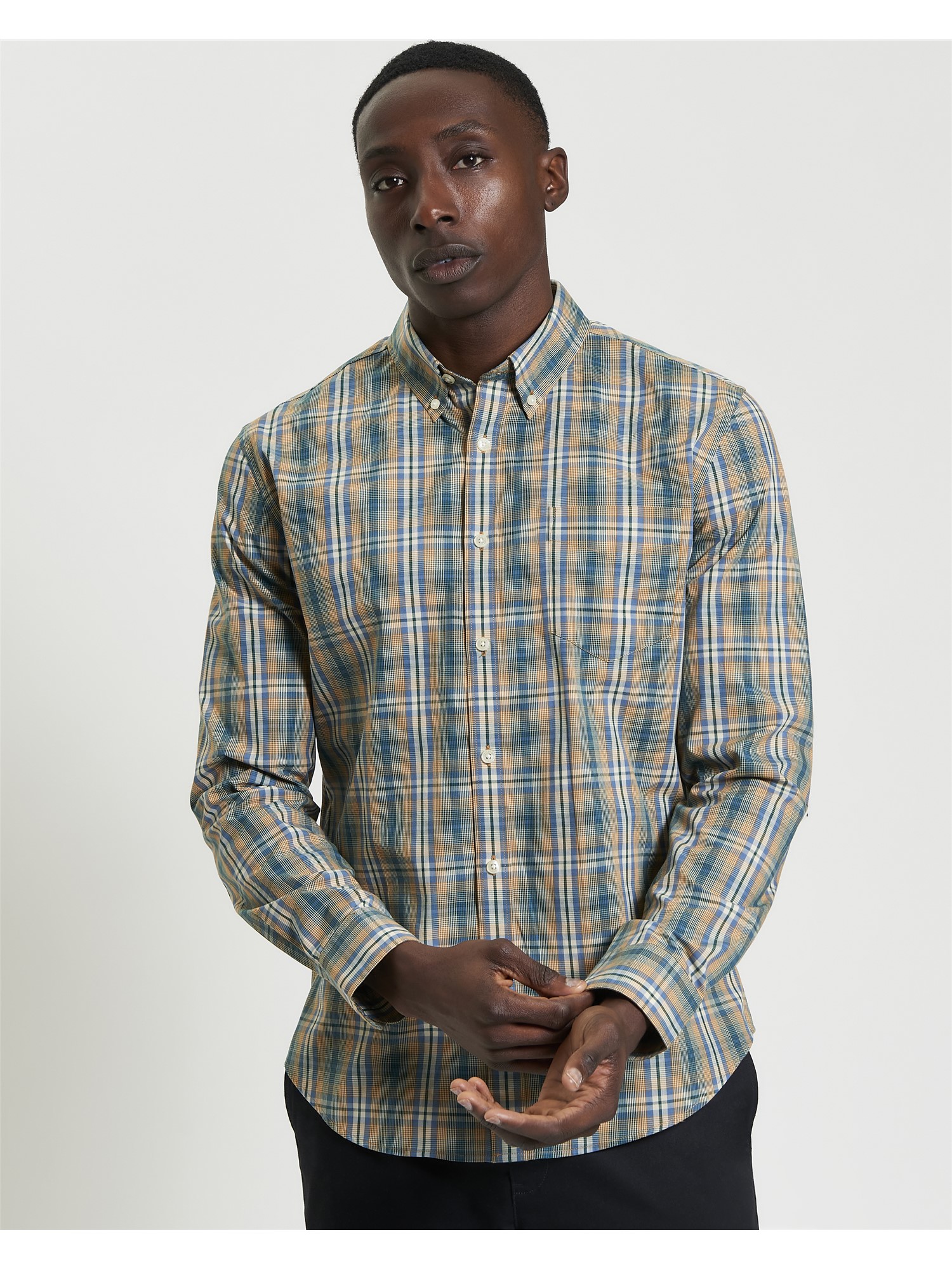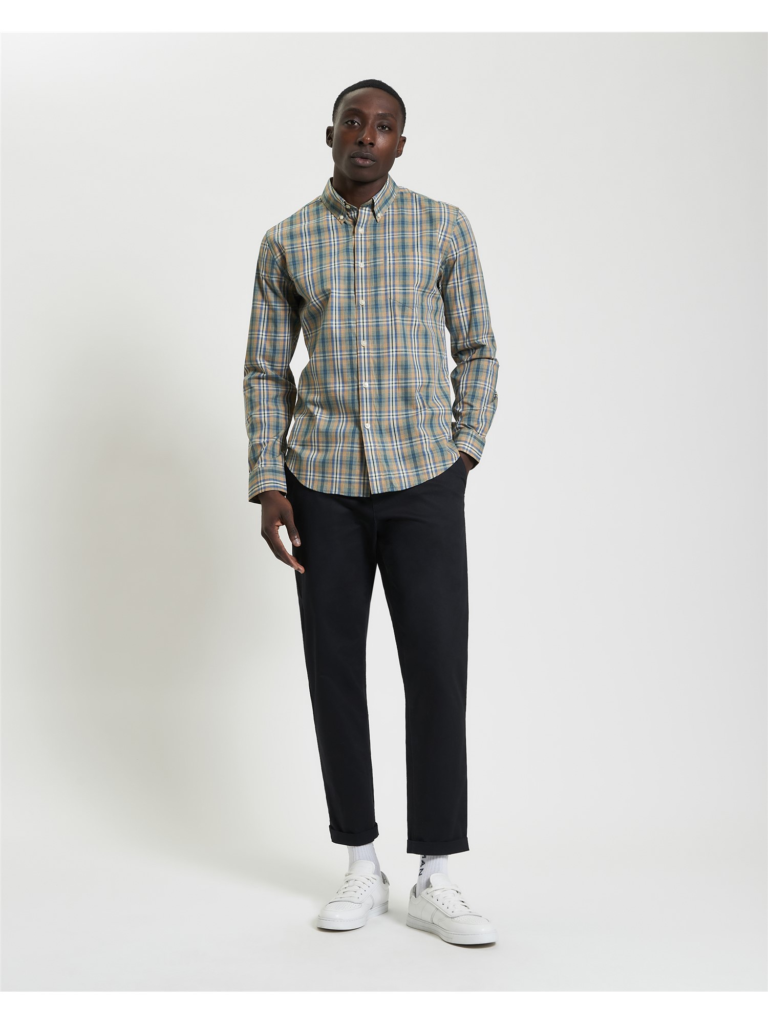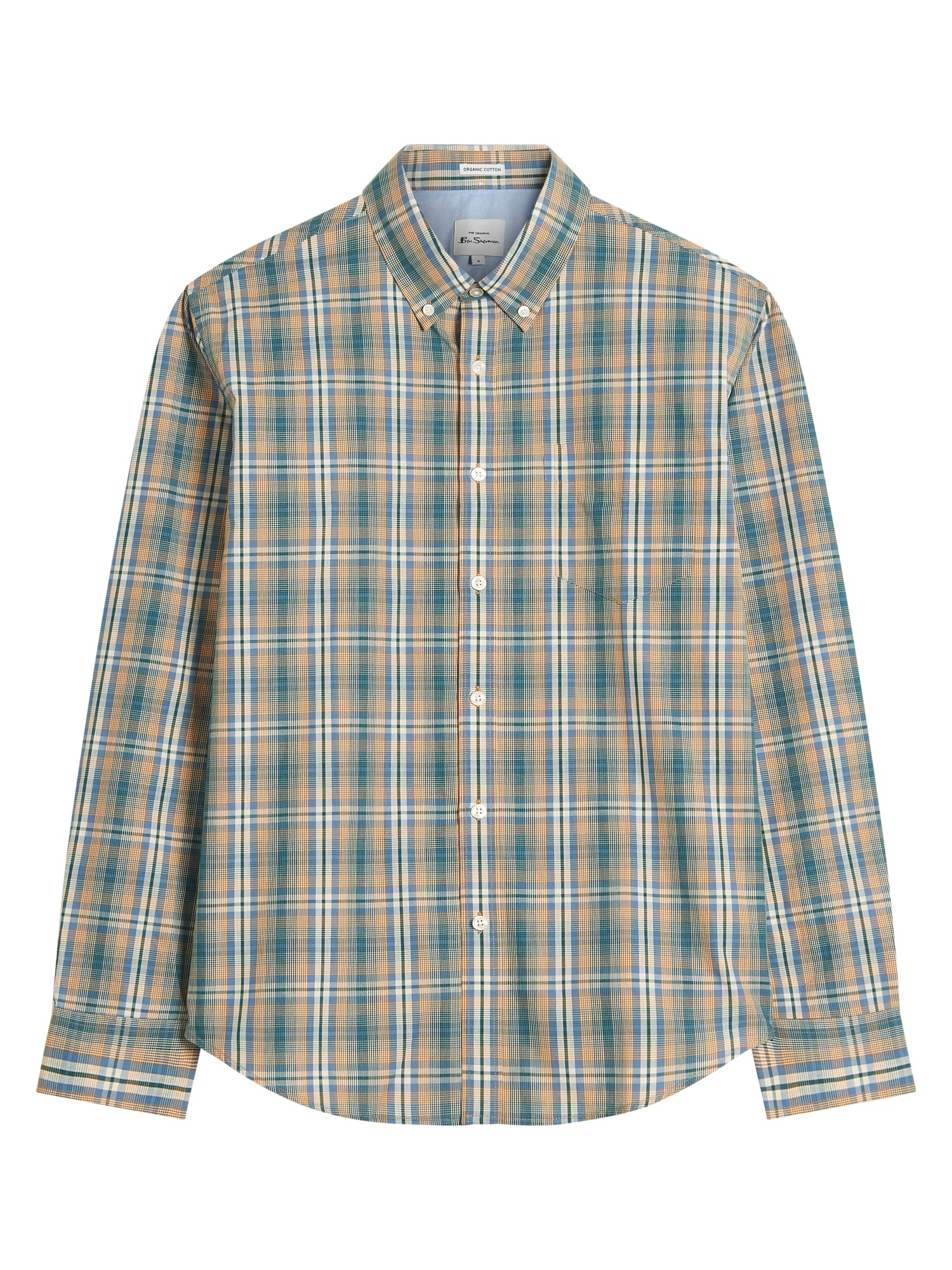 A regular fit shirt designed with a tartan check. Featuring a curved hem, two finger button down collar and a 'Ben Sherman' branded woven label at the side seam. Made from 100% organic cotton